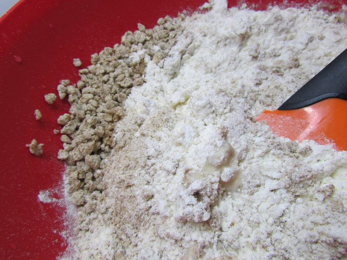 дрожжевую смесь добавить соль, муку, отруби и растительное масло.